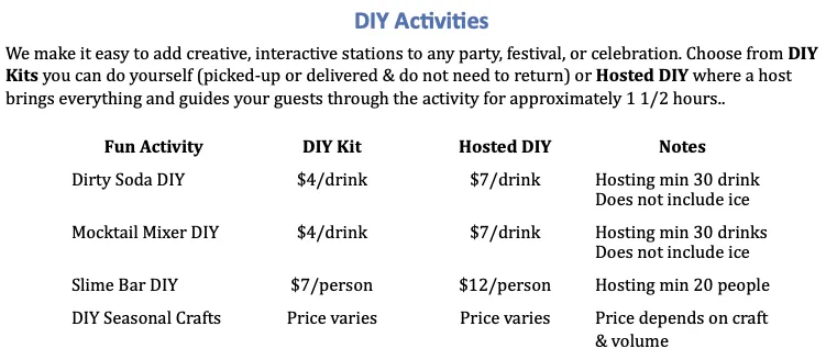 We can also provide add-on services to make your event even more memorable. These may include: mobile bartenders or mocktail mixers, face painters, balloon artists, DJs or MCs, and setup or cleanup assistance.